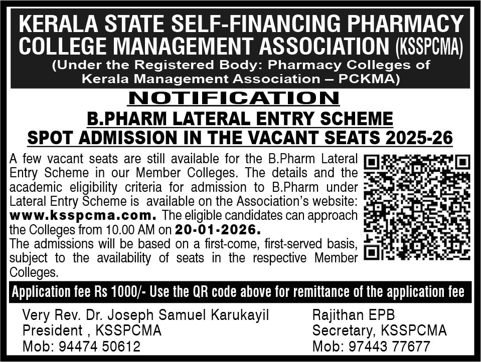 The Kerala State Self Financing Pharmacy College Managements Association (KSSPCMA) has decided to conduct a separate selection procedure for admission to the Pharmacy courses – B.Pharm, Pharm.D, D.Pharm, M.Pharm & Pharm.D (PB) Courses in the Member Colleges except for NRI seats and seats that may be set apart for allotment by the state and by the individual Member Colleges. Basically the B.Pharm course offers graduation in Pharmaceutical sciences which is the minimum qualification accepted for a registered Pharmacist in most of the developed countries. This course teaches students how to prepare and dispense medicine and make the students to convey the drug related information to the public. This course enables graduates to clear doubts about the prescriptions given by the doctors and can give more valuable advices on the health care programmes.