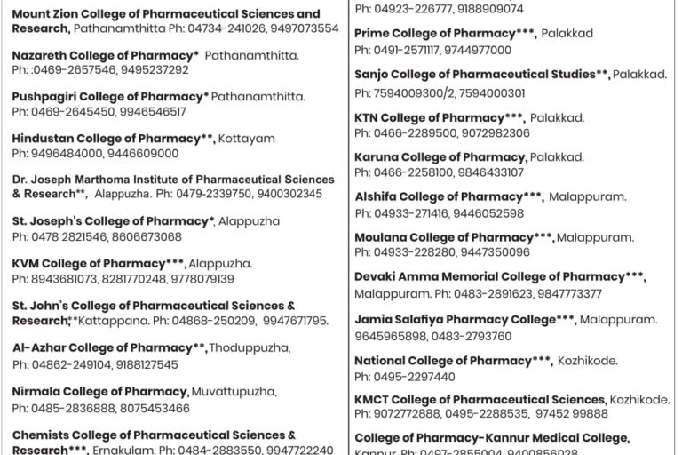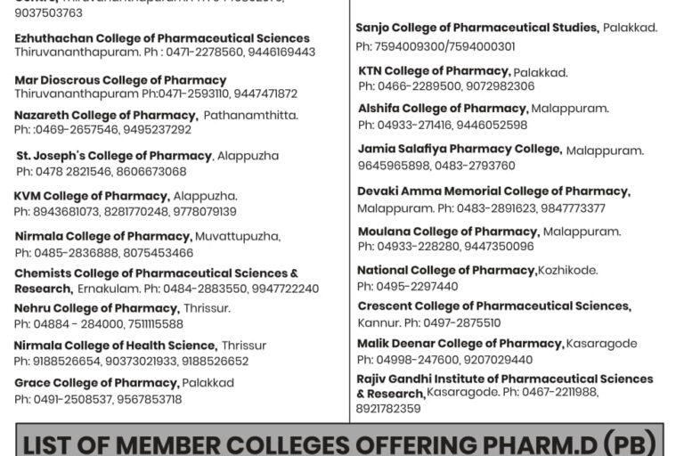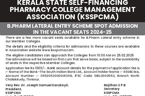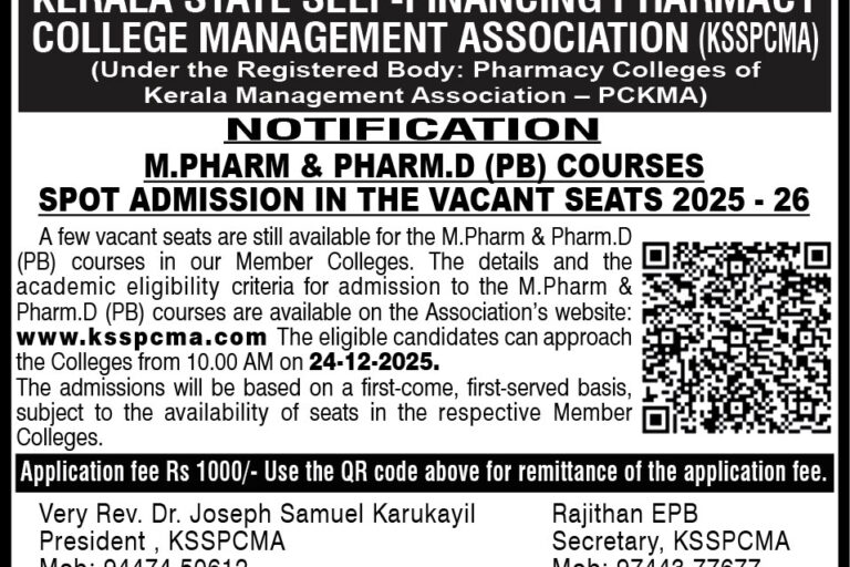 The Kerala State Self Financing Pharmacy College Managements Association (KSSPCMA) has decided to conduct a separate selection procedure for admission to the Pharmacy courses – B.Pharm, Pharm.D, D.Pharm, M.Pharm & Pharm.D (PB) Courses in the Member Colleges except for NRI seats and seats that may be set apart for allotment by the state and by the individual Member Colleges. Basically the B.Pharm course offers graduation in Pharmaceutical sciences which is the minimum qualification accepted for a registered Pharmacist in most of the developed countries. This course teaches students how to prepare and dispense medicine and make the students to convey the drug related information to the public. This course enables graduates to clear doubts about the prescriptions given by the doctors and can give more valuable advices on the health care programmes.